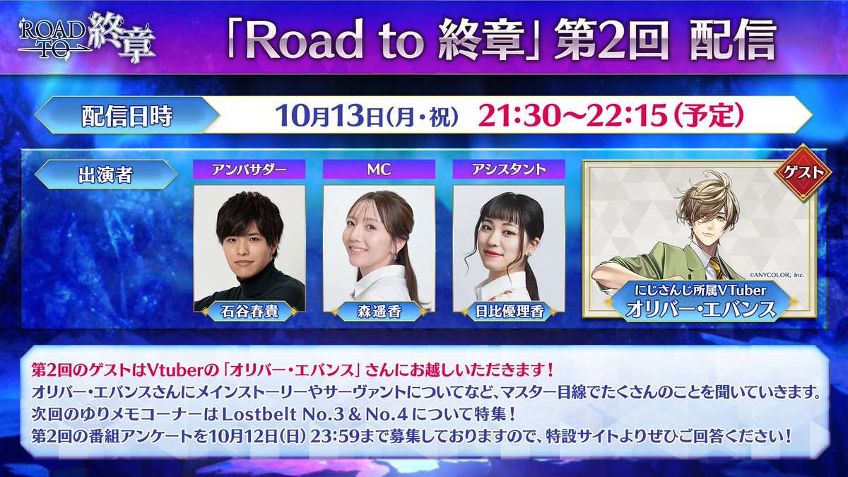 来週10月13日(月・祝)21:30から生配信「Road to 終章」第2回のゲストは「にじさんじ所属VTuber オリバー・エバンス」さんが出演!